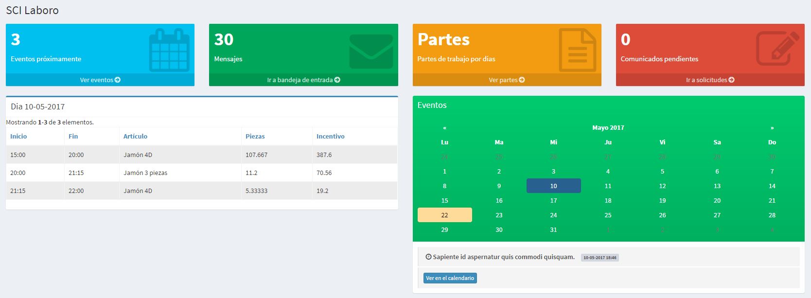 En primer lugar vemos cuatro paneles de notificación que nos informan de los eventos próximos, mensajes nuevos y comunicados pendientes, así como nos proporcionan un acceso directo a los partes. Haciendo click en el enlace de la parte inferior nos llevará al apartado correspondiente.