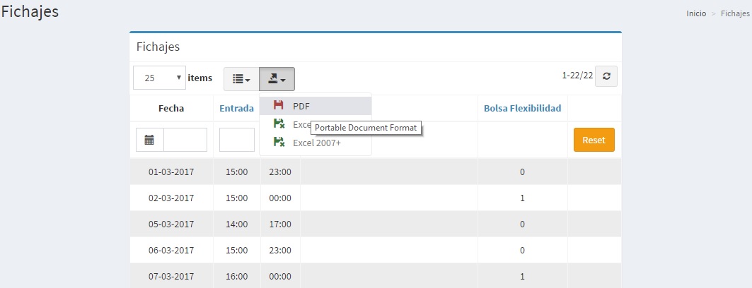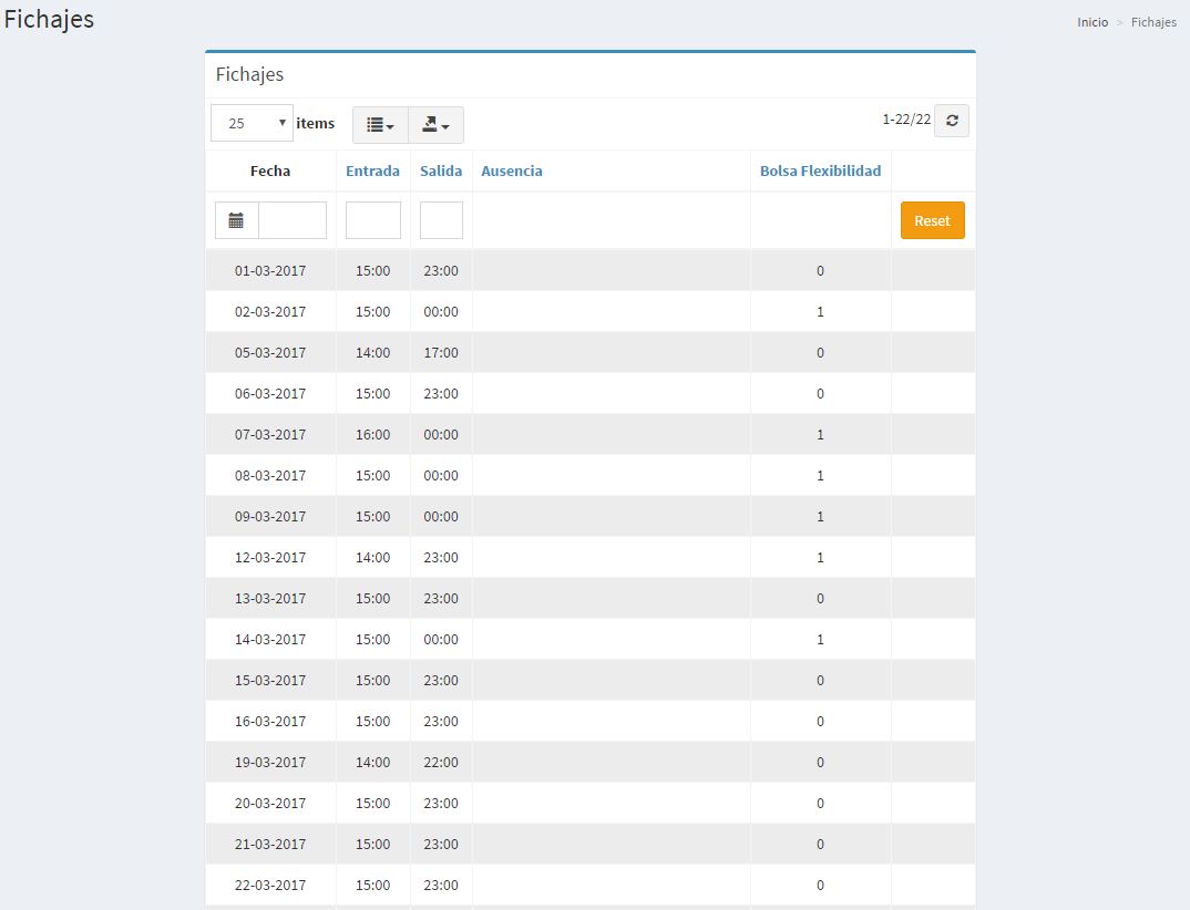La fecha del mismo, hora de entrada y hora de salida, si ha sido una ausencia el motivo y el valor de la bolsa de flexibilidad. También podremos filtrar por fecha y exportar los fichajes en varios formatos.