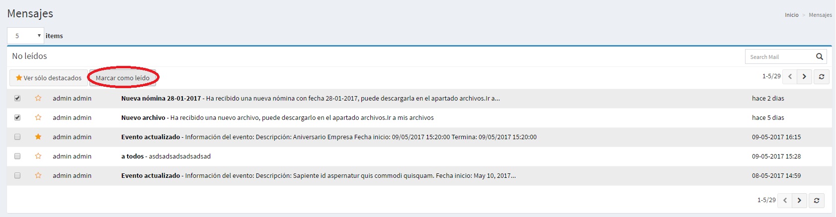 Para marcar como leído o como no leído, debemos seleccionar aquellos mensajes que deseemos, haciendo click en el campo situado a la izquierda de la estrella de destacado de cada mensaje. Una vez tenemos los mensajes seleccionamos haremos click en el botón de marcar correspondiente. Si marcamos como leído los mensajes nos aparecerán en la bandeja inferior; si marcamos como no leído se volverán a visualizar en la bandeja superior.