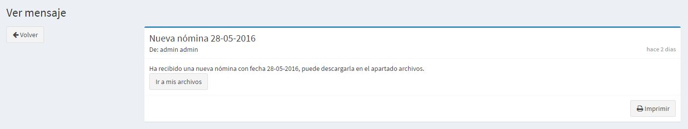 Para abrir un mensaje, deberemos hacer click sobre el mismo. Se mostrará otra pantalla que nos muestra el asunto y el contenido del mensaje, el remitente, la fecha y los archivos adjuntos si los hubiese. En éste momento se marca el mensaje como leído, por lo que pasará a mostrarse en la bandeja inferior.