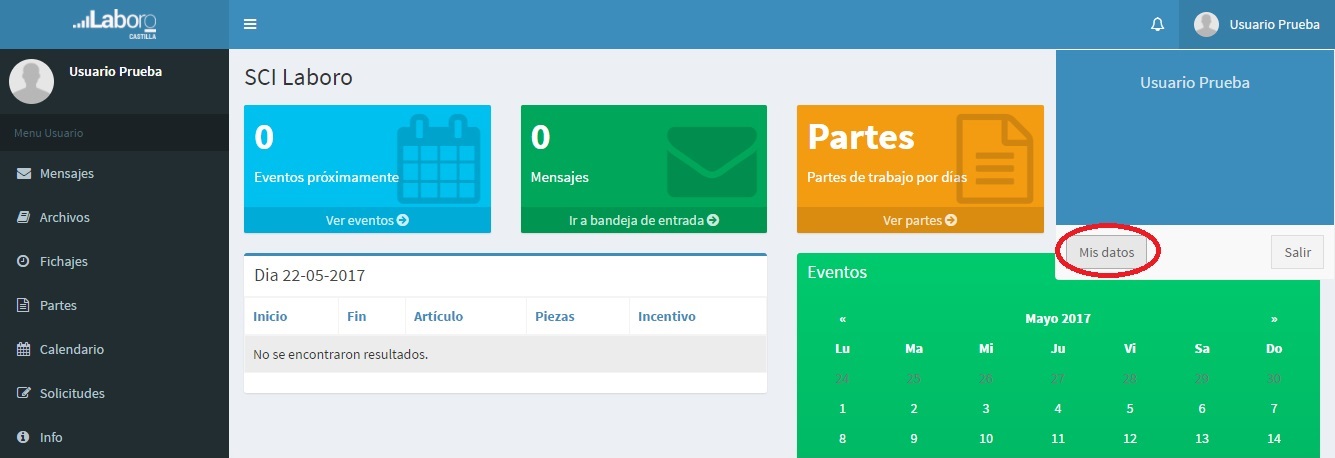 Para acceder a los datos del perfil, debemos hacer click en nuestro nombre situado en la parte superior derecha de la ventana, donde se desplegará un panel con dos botones. A la derecha el botón de salir, y a la izquierda el botón "Mis datos". Haciendo click en este último accederemos a nuestro perfil.