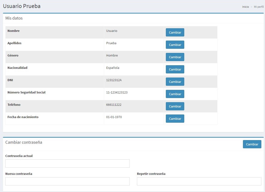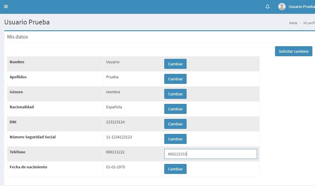 No es posible modificar los datos pèrsonales directamente, deberemos solicitarlos al administrador. Para ello encontramos el botón "Cambiar" situado a la derecha de cada campo.