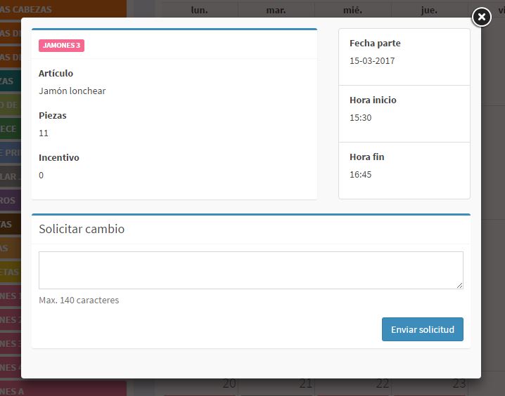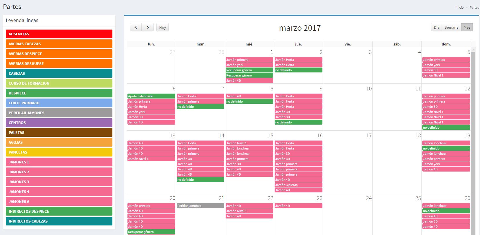 Al acceder al apartado partes, se muestra una leyenda de los colores de cada línea de trabajo y un calendario. En cada día del calendario se mostrará un elemento con cada parte de producción de ése día, del color de la línea correspondiente y el nombre del artículo en cuestíon trabajado.