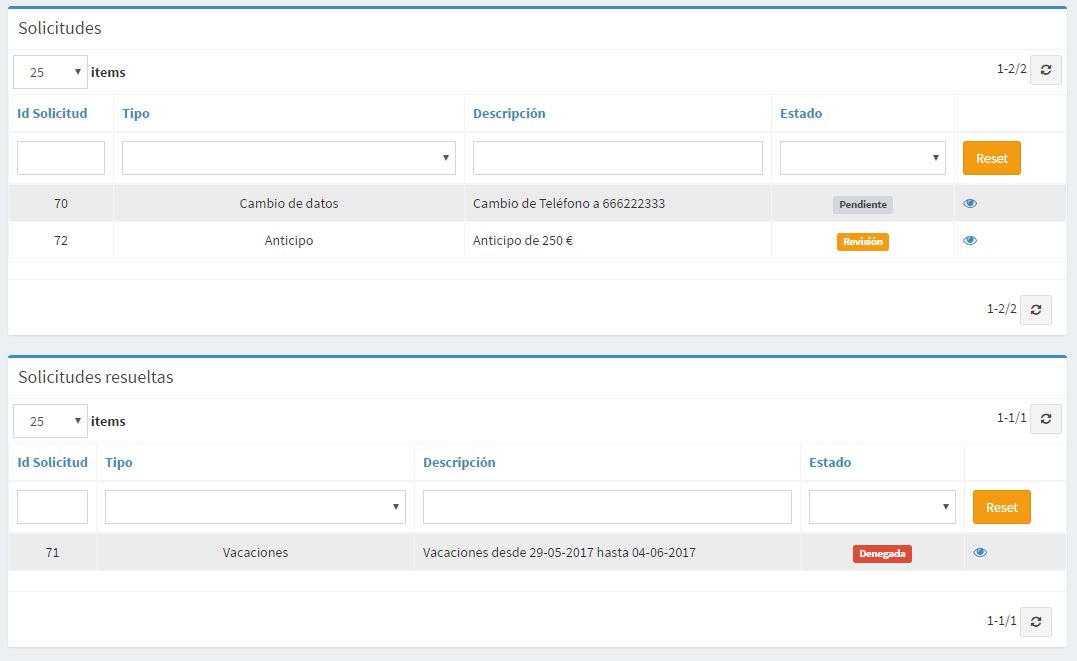 En la parte inferior de la pantalla encontramos dos paneles, uno con las solicitudes pendientes o en revisión, y otro con las solicitudes resueltas, ya sean aceptadas o denegadas.