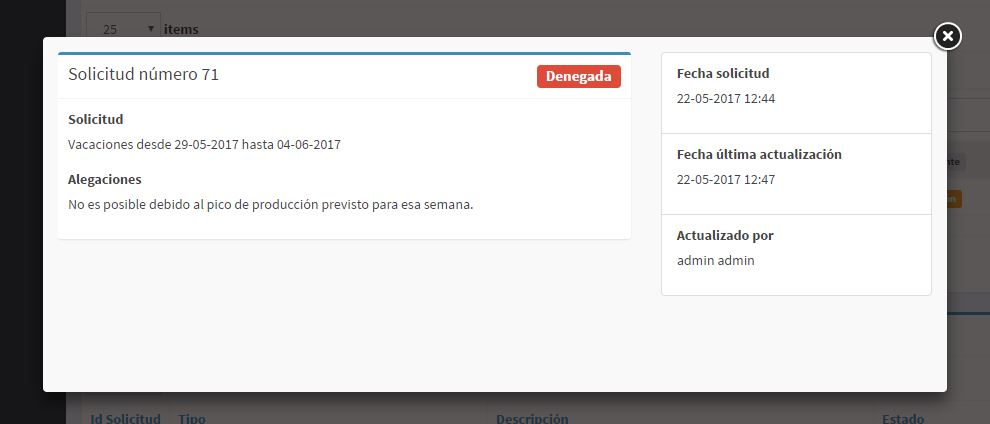 Haciendo click en el icono del ojo situado a la derecha de cada solicitud, se abre una venta dónde podemois ver la solicitud y sus detalles: número identificativo de la solicitud, estado, el texto de aquello que solicitamos, fecha de la solicitud, fecha de la última actualización de la misma, persona que la actualizó y alegaciones si las hubiese.